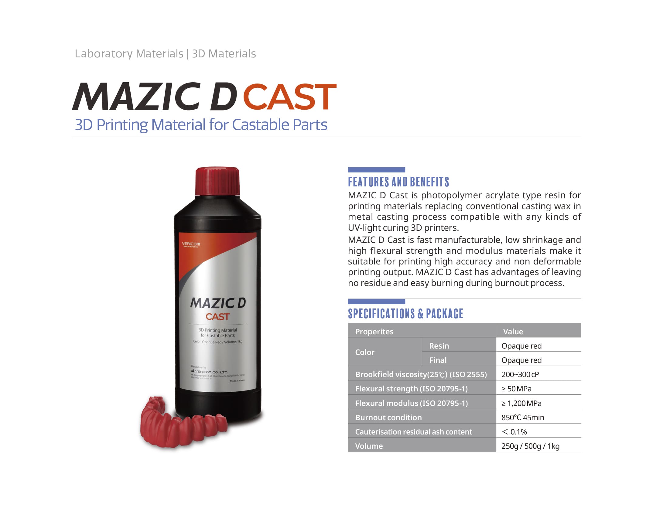 MAZIC® D CAST is photopolymer acrylate type resin for printing materials replacing conventional casting wax in metal casting process compatible with any kinds of UV-light curing 3D printers. MAZIC® D CAST is fast manufacturable, low shrinkage and high flexural strength and modulus materials make it suitable for printing high accuracy and non deformable printing output. MAZIC® D CAST has advantages of leaving no residue and easy burning during burnout process.